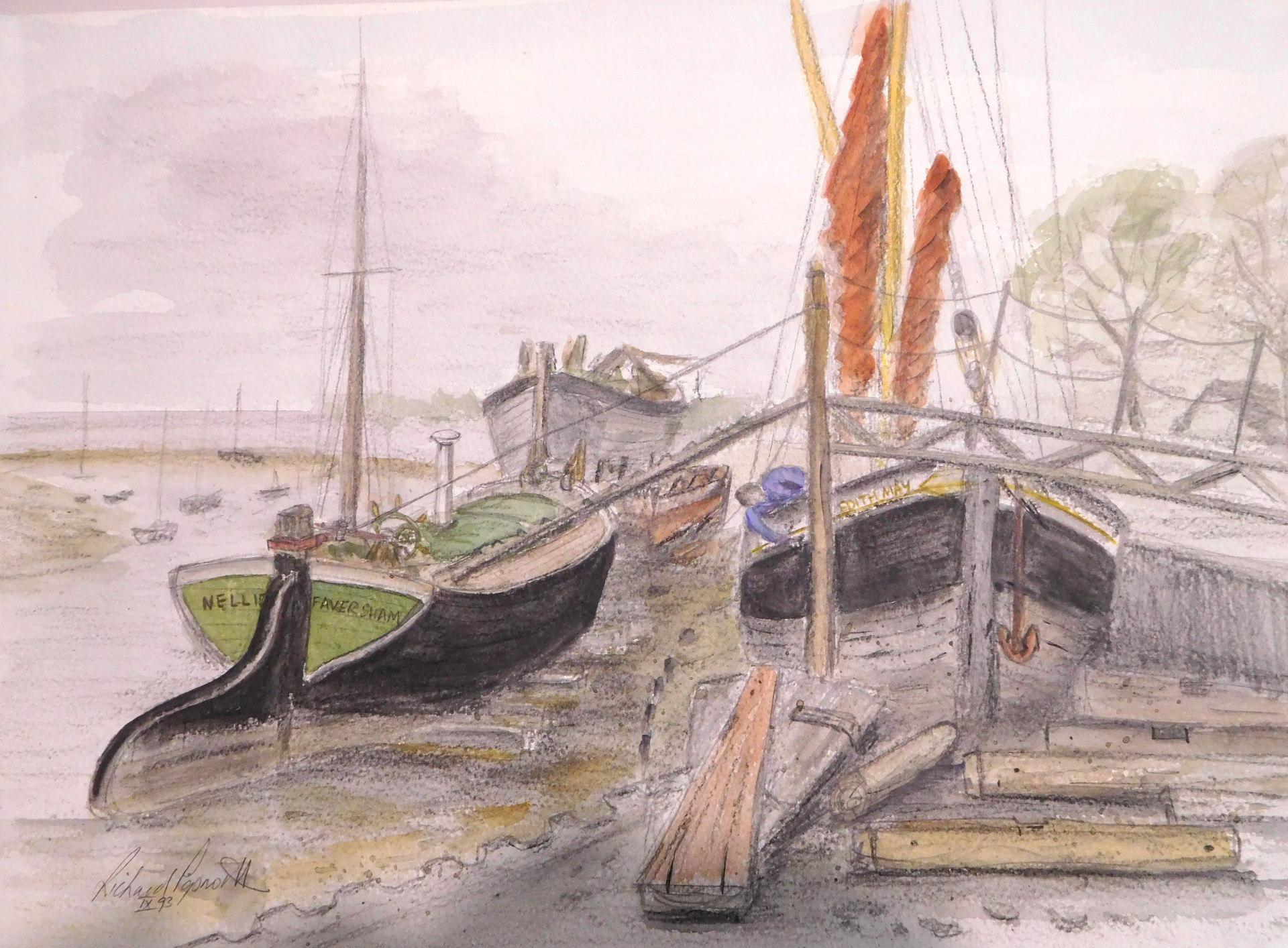 Original Pencil and Watercolour Painting - Thames Barges at Maldon